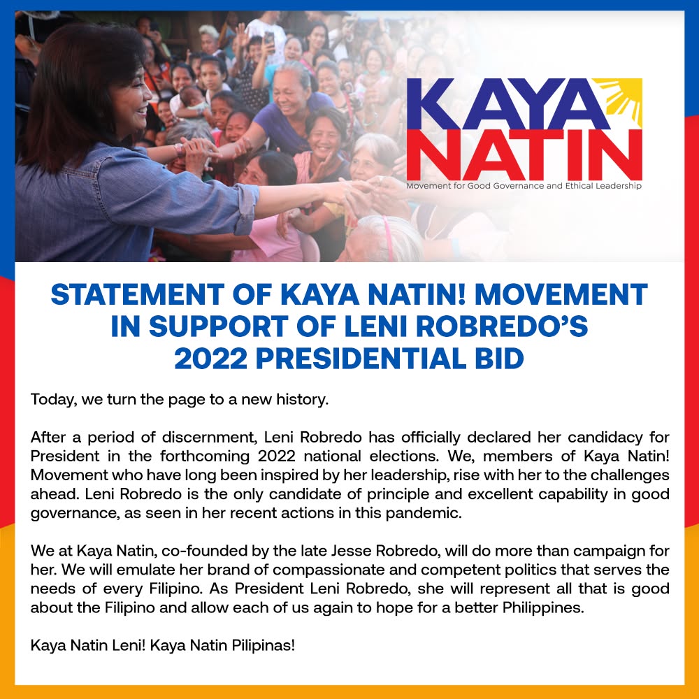 After a period of discernment, Leni Robredo has officially declared her candidacy for President in the forthcoming 2022 national elections. We, members of Kaya Natin! Movement who have long been inspired by her leadership rise with her to the challenges ahead. Leni Robredo is the only candidate of principle and excellent capability in good governance, as seen in her recent actions in this pandemic.