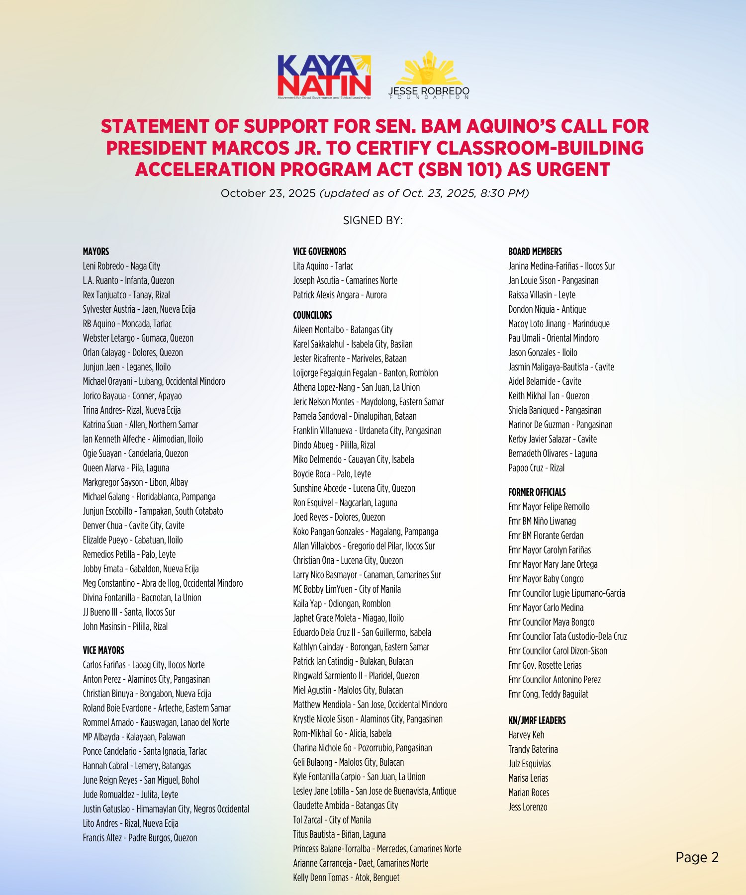 We, the leaders, fellows, and members of the Kaya Natin! Movement for Good Governance and Ethical Leadership and the Jesse M. Robredo Foundation, wholeheartedly express our robust support for Senator Bam Aquino’s Classroom-Building Acceleration Program Act (Senate Bill No. 121).