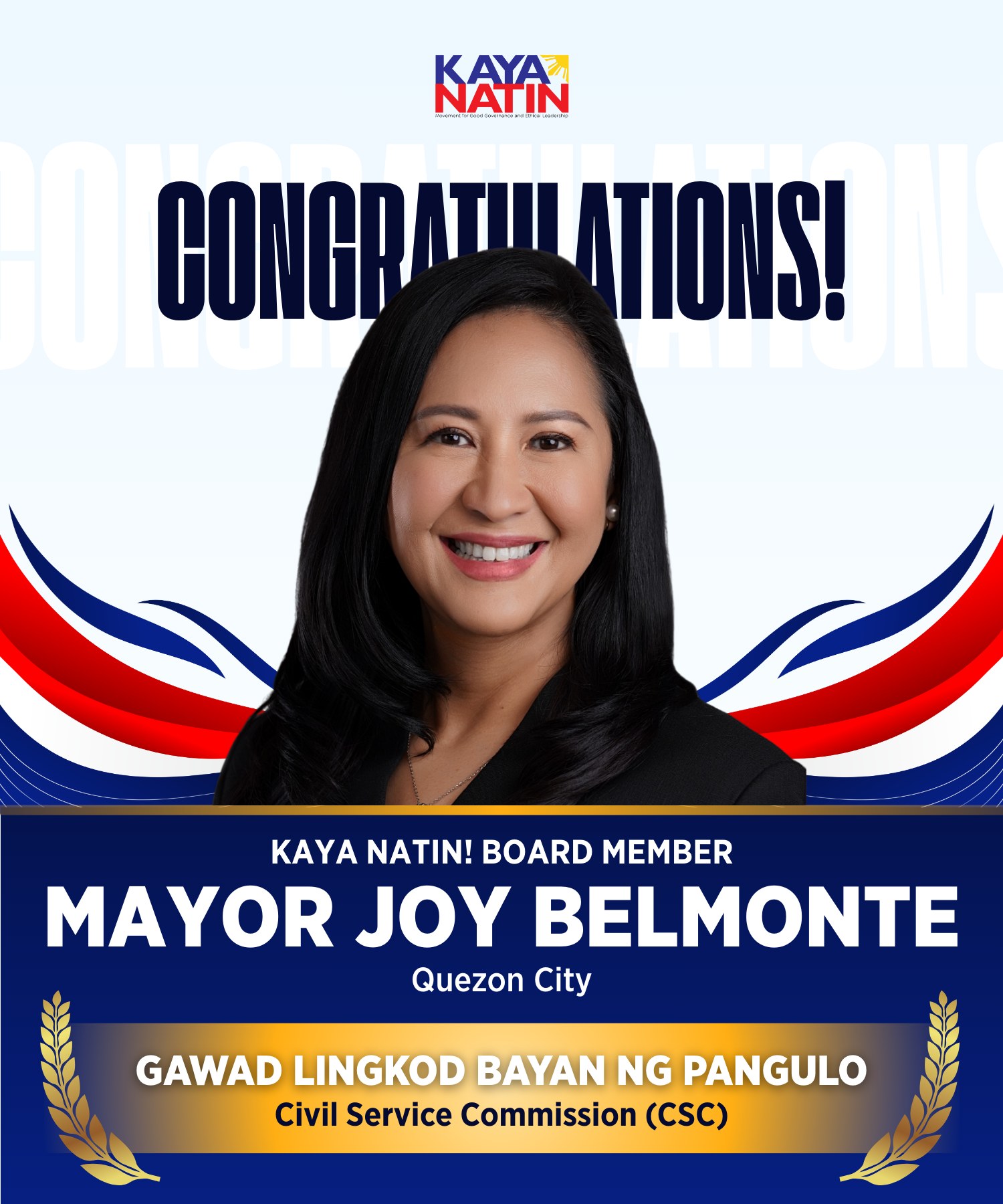 The Kaya Natin! Movement proudly congratulates our esteemed Board Member, Quezon City Mayor Joy Belmonte, on being a recipient of the Gawad Lingkod Bayan ng Pangulo from the Civil Service Commission (CSC).